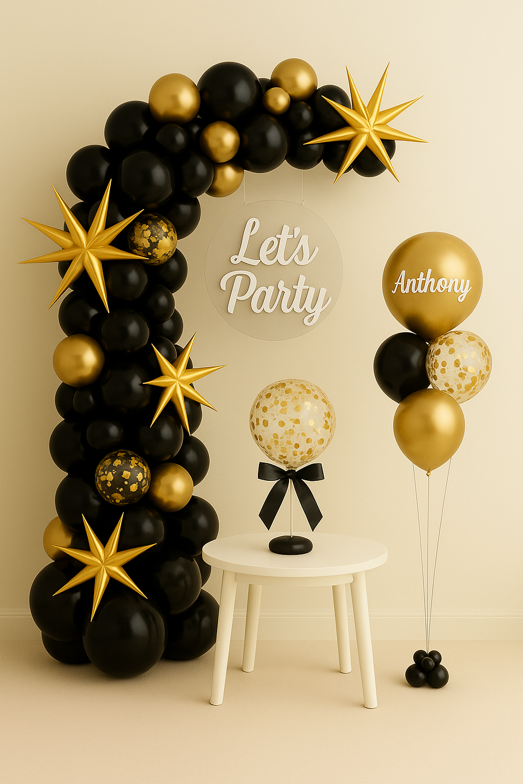 A bold and timeless design, Midnight Lux brings all the drama and decadence of a black-tie celebration to your space. Featuring rich black tones, glimmering gold chrome accents, and premium starburst detailing, this all-black set creates a stunning focal point for milestone birthdays, retirement send-offs, or luxe evening soirées. Whether styled at home or at a venue, Midnight Lux makes a powerful statement — without the stress of sourcing or assembly.